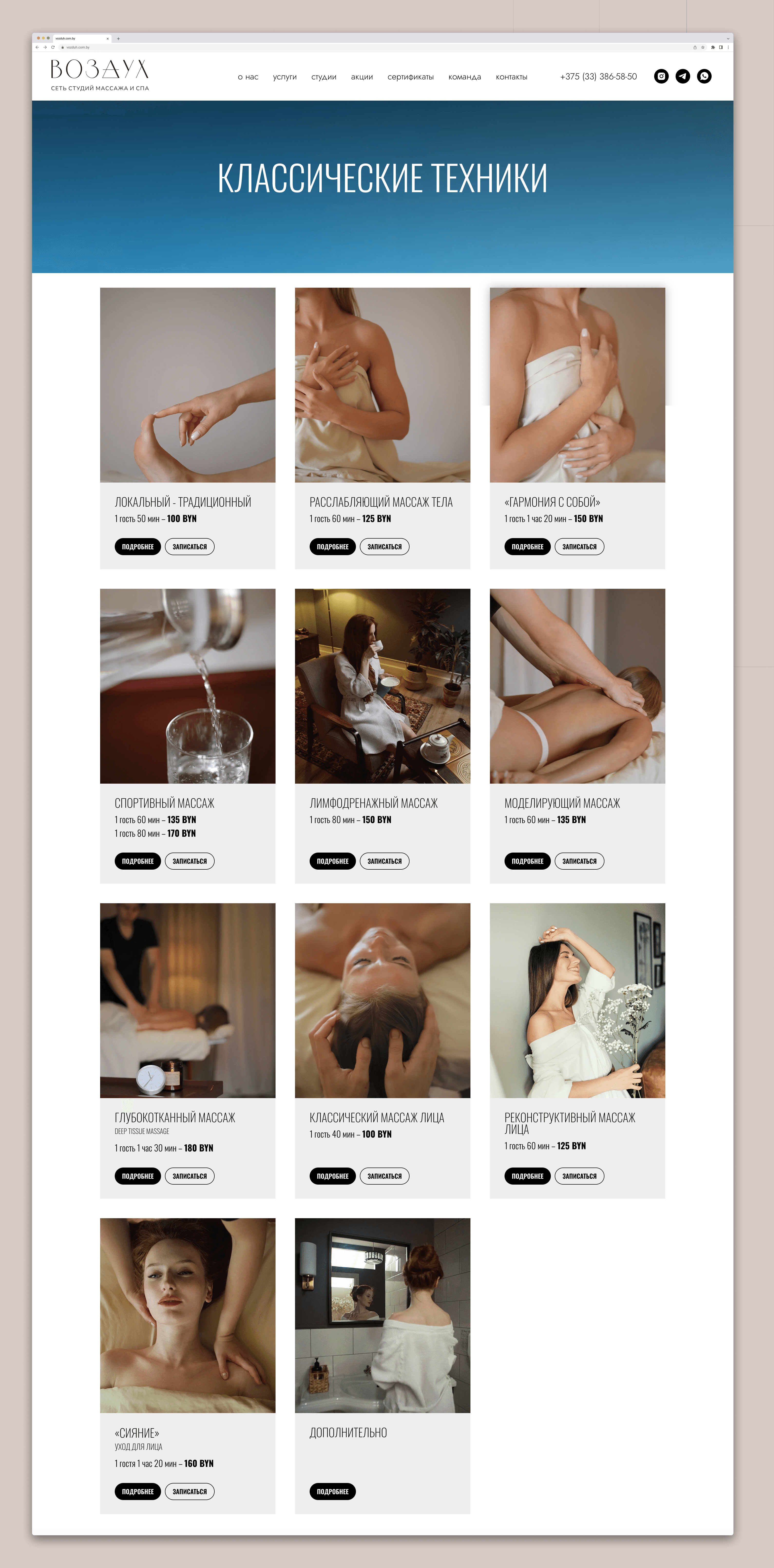 Vozduh is a massage and relaxation studio offering wellness and SPA services focused on comfort, care, and a peaceful atmosphere. My goal was to create a modern brand identity and website that reflect the studio’s core values — lightness, calmness, and trust. I developed a clean visual system and designed a user-friendly website that helps clients easily explore services, discover special programs, and book appointments online. The final result strengthened the studio’s online presence and delivered a consistent, warm, and relaxing brand experience across digital channels.